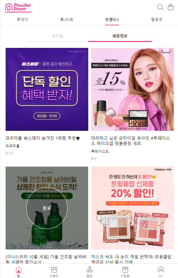 "파우더룸"에서 한 눈에 볼 수 있게 세일정보를 정리해주니 땡큐죠~