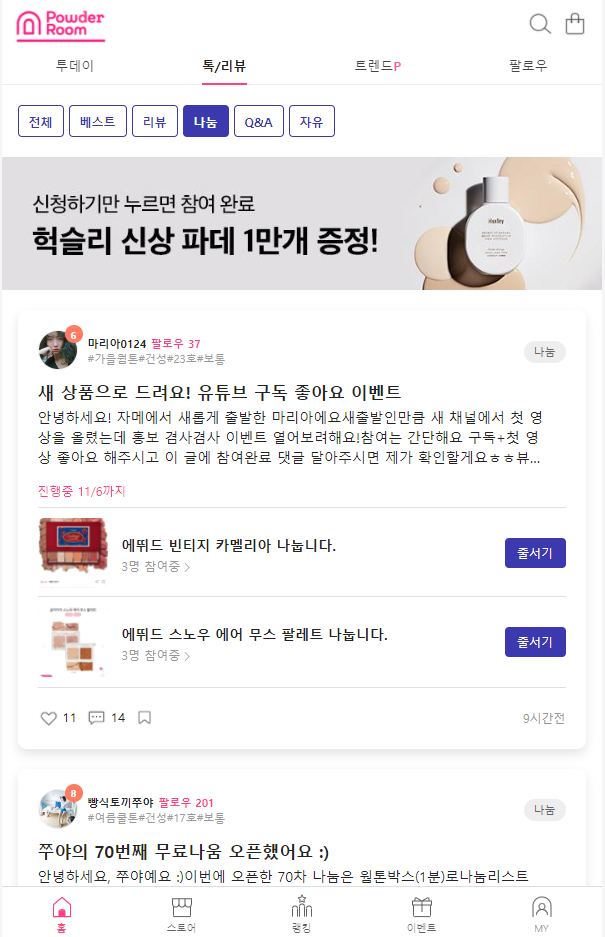 "파우더룸" 체험단을 통해 신상을 무료로 체험도 해볼수 있는 기회도 받고