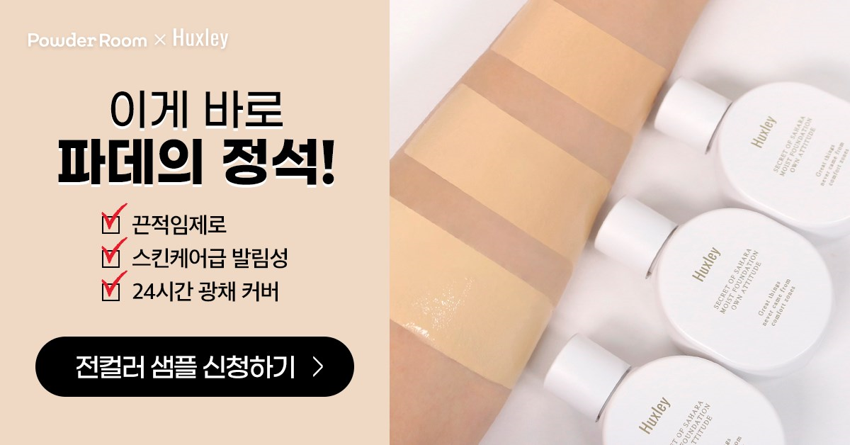 그리고 지금 "파우더룸"에서 파데의 정석, 헉슬리 #모이스트 파운데이션 1만 샘플링 이벤트를 진행중이에요~