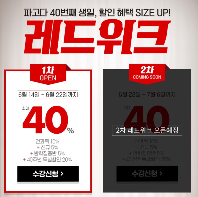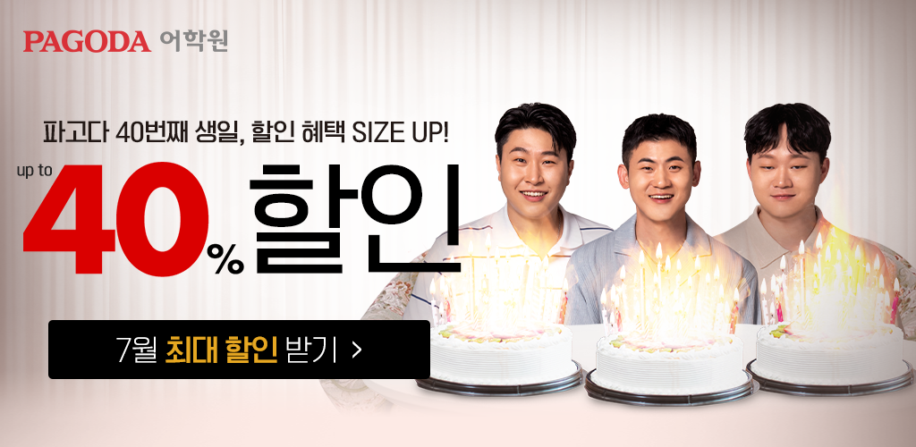 파고다어학원에서는 이번 레드위크 동안 수강료를 최대 40% 할인해 준대요.
